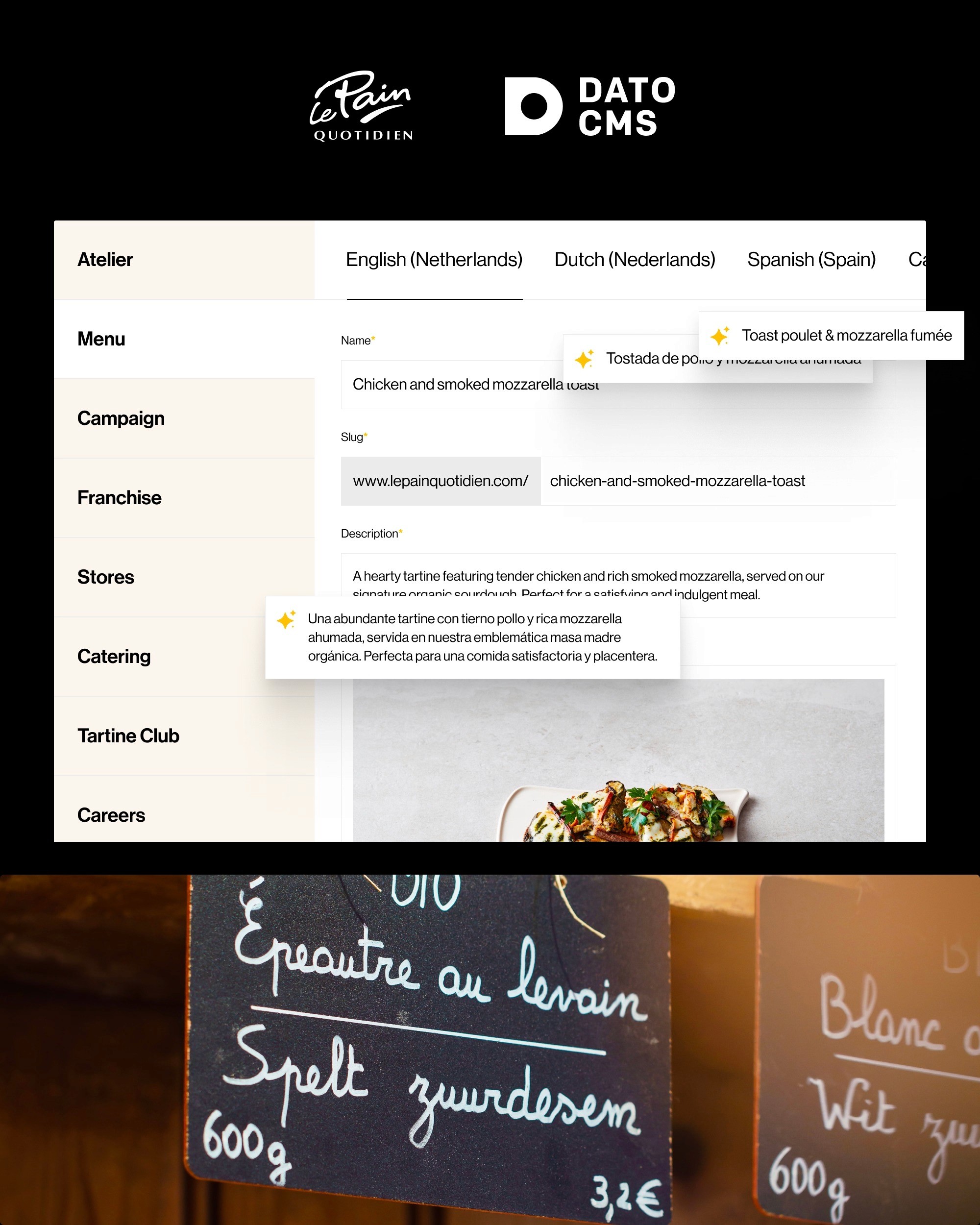 The goal was to make the website feel as intentional as walking into a Le Pain Quotidien bakery. The homepage opens with a quiet manifesto: a poem, a loaf, and the "fourth ingredient" of the bread, time, before any menu appears. Atelier, menu, and magazine pages weave story, craft, and large imagery into every visit, so guests sense the brand before they order. Under the hood, a Next.js frontend and DatoCMS backend power modular blocks, AI‑assisted translation, and clear governance. HQ and local teams manage 25+ countries and 40+ locales from one source of truth. The result: a scalable platform where the core philosophy stays intact, and each country tells it in its own accent.