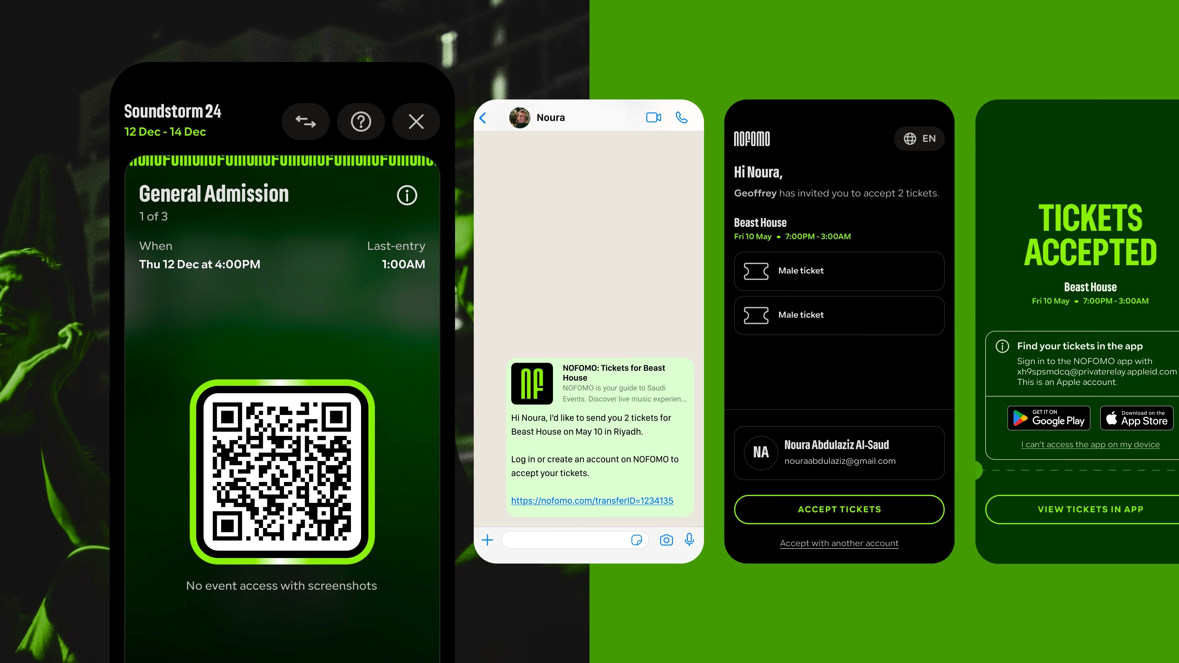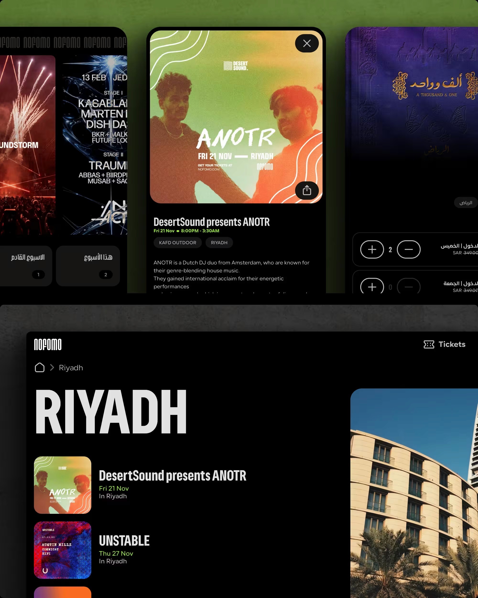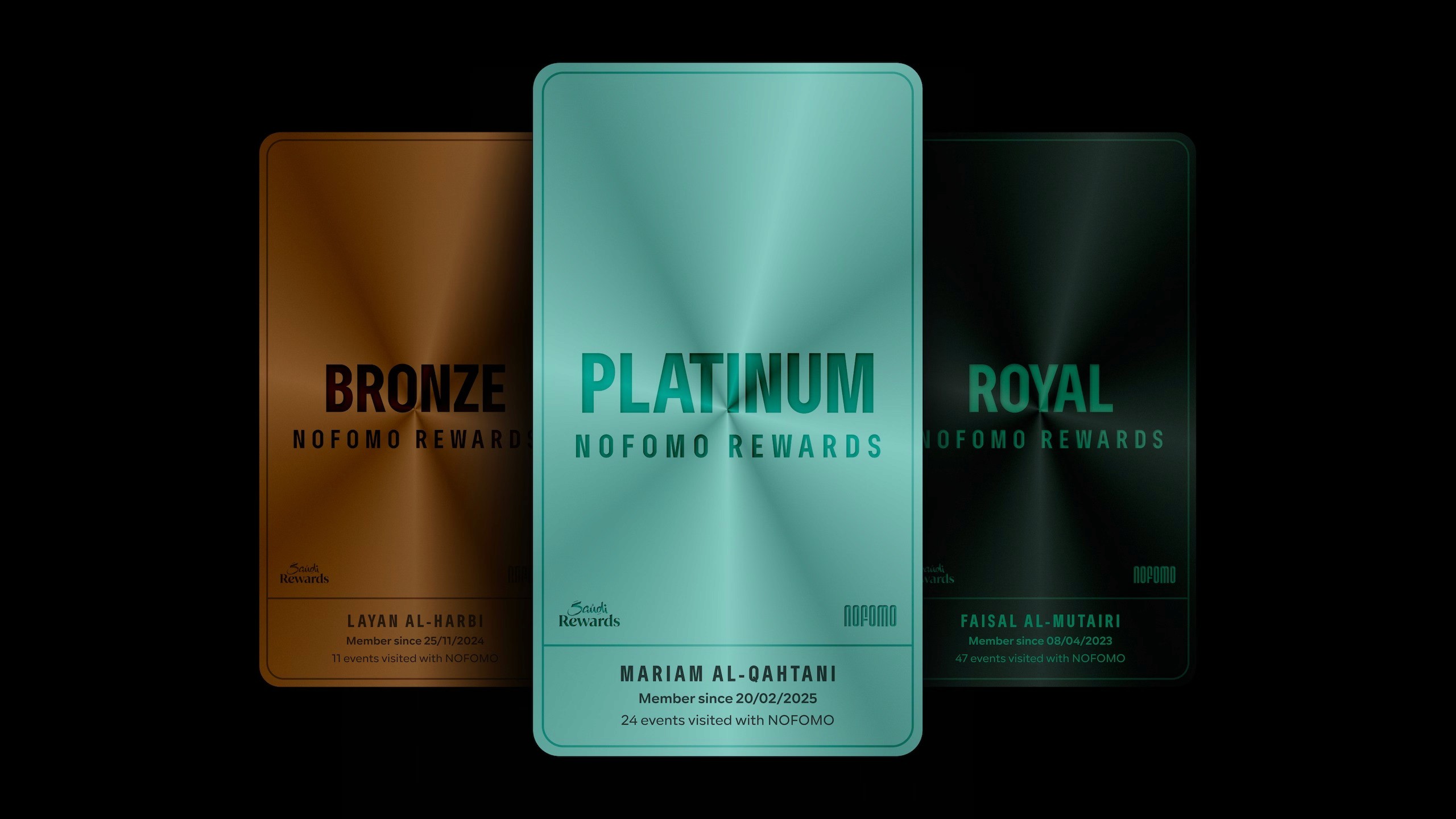NOFOMO was built from scratch as a fully bilingual (Arabic/English), mobile-first platform unifying discovery, ticketing, and event access. It solves real problems: e-ticketing, secure QR codes, fraud prevention, seamless transfers. Every event became a learning lab, shipping improvements every two weeks. But NOFOMO goes beyond ticketing. A built-in loyalty program drives year-round engagement, shapes features based on behavior, and powers social sharing and in-app transfers.