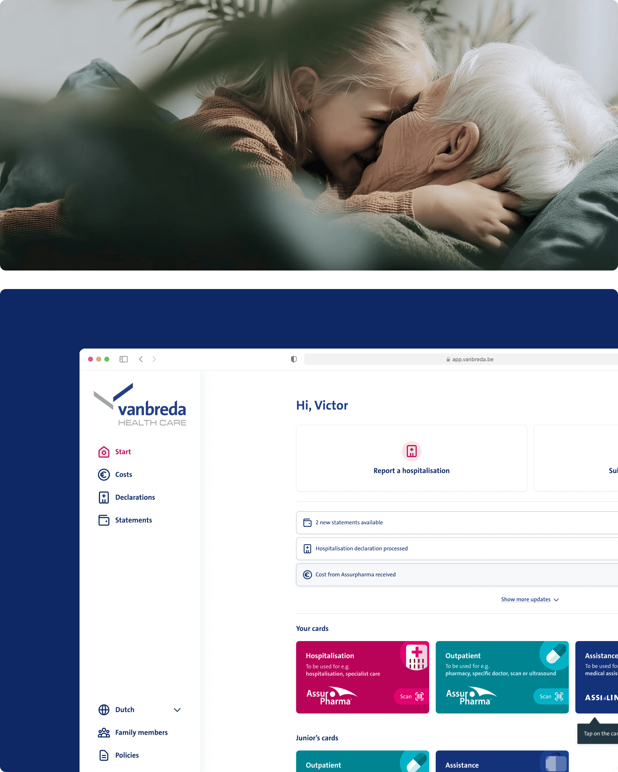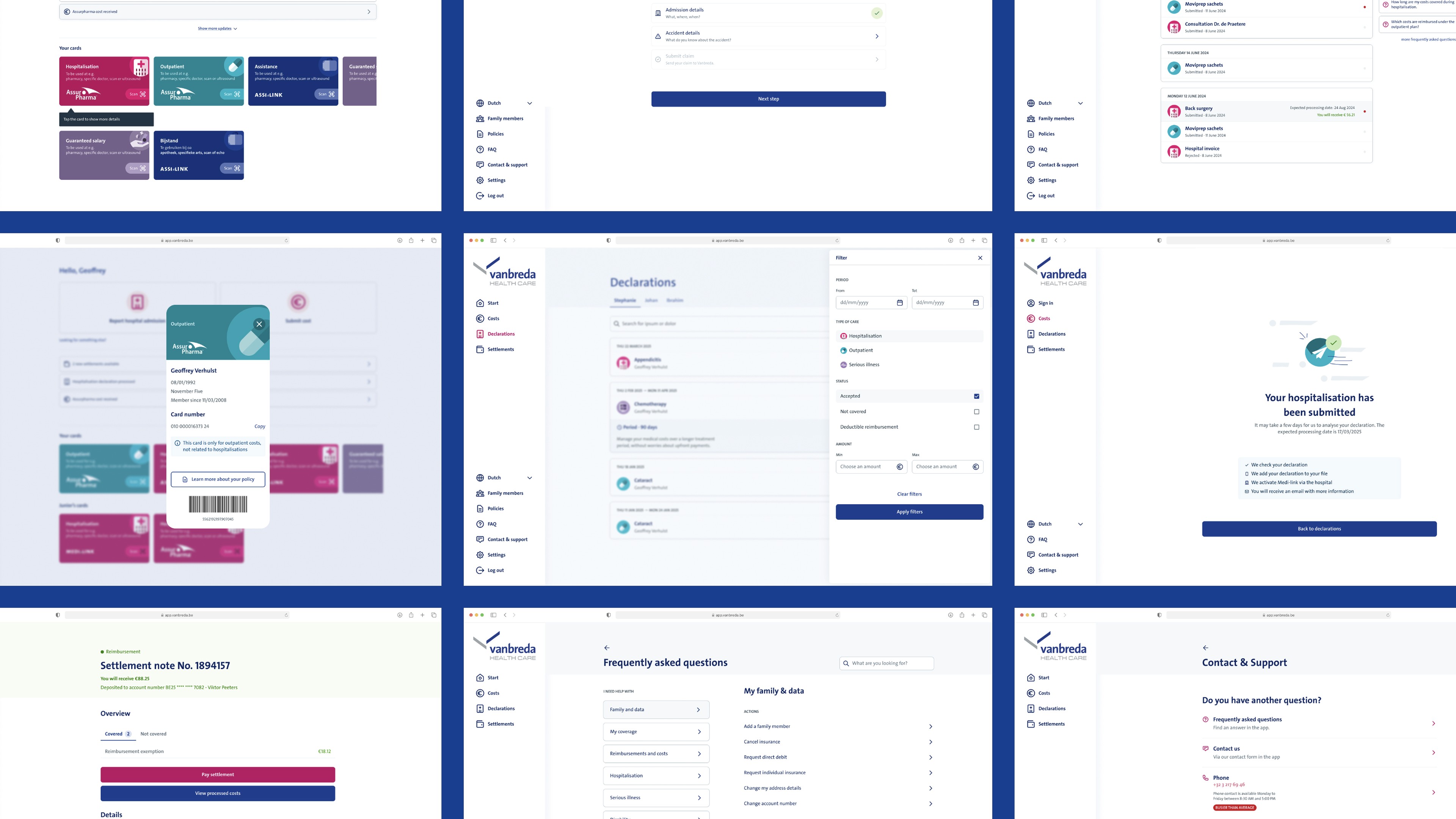 Many Vanbreda customers manage long-term treatments or care for family members, often with low digital confidence. We treated this as a design constraint: AA WCAG compliance, flows that tolerate shaky hands and poor lighting, document enhancement for bad scans, and controlled access so relatives can manage a policy when health makes self-service impossible. This is how the platform serves over 330k customers, not just the digital natives.